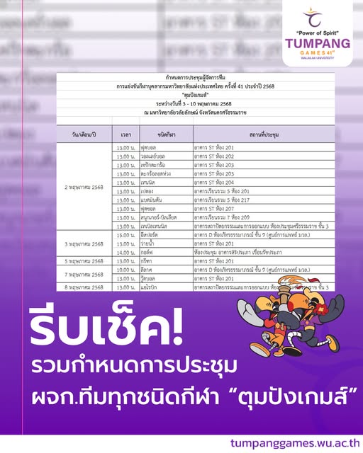 โดยมี รศ.ชาญชัย สุขสุวรรณ์ ประธานอนุกรรมการฝ่ายส่งเสริมกีฬาเพื่อความเป็นเลิศ พร้อมด้วยคณะอนุกรรมการ และผศ.มาริสา ภูมิภาค ณ หนองคาย ผู้แทนมหาวิทยาลัยวลัยลักษณ์ เจ้าภาพจัดการแข่งขันกีฬาบุคลากรมหาวิทยาลัยแห่งประเทศไทยครั้งที่ 41 “ตุมปังเกมส์ผู้แทน เพื่อเตรียมความพร้อมสำหรับ การแข่งขันกีฬาบุคลากรมหาวิทยาลัยแห่งประเทศไทยครั้งที่ 41 แหล่งข่าว : เพจ The