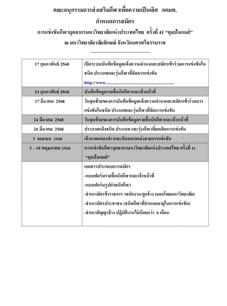 แจ้งกำหนดการสมัครการแข่งขันกีฬาบุคลากรมหาวิทยาลัยแห่งประเทศไทย ครั้งที่ 41 “ตุมปังเกมส์” ณ มหาวิทยาลัยวลัยลักษณ์ จังหวัดนครศรีธรรมราชBy Sakmon Monvinya / 02/02/2025