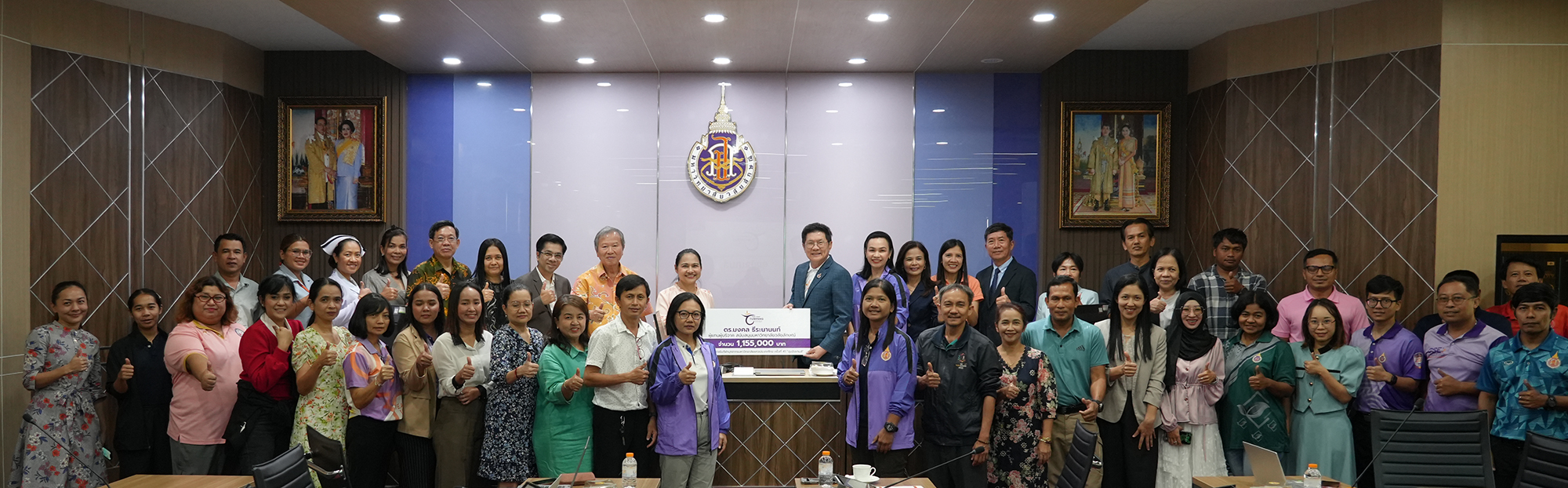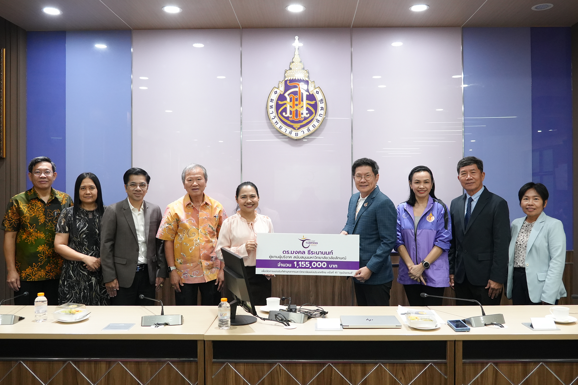 เมื่อวันที่ 6 มีนาคม 2568 รศ.ดร.อุไร จเรประพาฬ รองอธิการบดีมหาวิทยาลัย รับมอบเงินบริจาค 1,155,000 บาท (หนึ่งล้านหนึ่งแสนห้าหมื่นห้าพันบาทถ้วน) จากผู้ประกอบการจากหลากหลายพื้นที่ มากกว่า 14 ราย โดยมี ดร.มงคล ธีระนานนท์ รองอธิการบดีมหาวิทยาลัย เป็นผู้แทนในการมอบเงินบริจาค เพื่อสนับสนุนการจัดการแข่งขันกีฬาบุคลากร มหาวิทยาลัยแห่งประเทศไทย ครั้งที่ 41 “ตุมปังเกมส์” ณ ห้องประชุมเขาหลวง อาคารสหกิจศึกษา